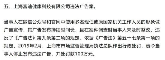 2019年,上海富迪健康科技有限公司因使用多名國家機(jī)關(guān)工作人員的形象做廣告宣傳,被罰款100萬元。