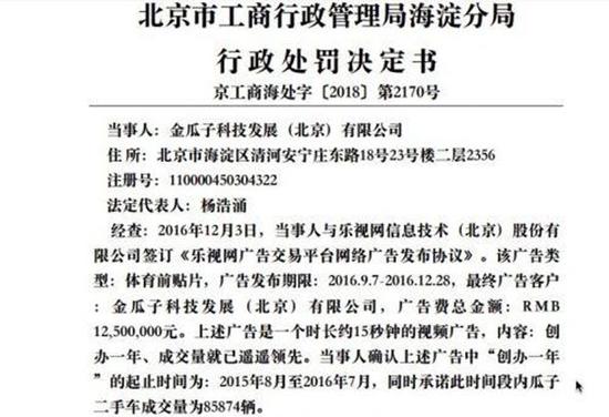 2018年11月15日,金瓜子科技發(fā)展(北京)有限公司因在廣告中使用瓜子二手車“創(chuàng)辦一年、成交量就已遙遙領(lǐng)先”的不實宣傳語,被罰款1250萬元。