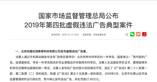 北京尚德在線教育科技有限公司在廣告中宣稱“一年學(xué)完,國家承認(rèn)”,實際無法頒發(fā)學(xué)歷證書,被罰款27.93萬元。