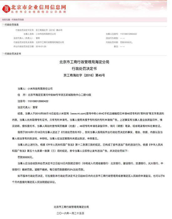 2016年1月25日,小米公司在官網(wǎng)出現(xiàn)“小米4C手機(jī)邊緣觸控已申請46項專利的”文字宣傳,但其實專利沒拿到,被處以3萬元罰款。